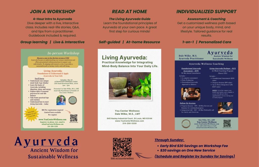 A 4-hour live, interactive experience where Dale guides you through the basics of Ayurveda in a way that’s easy to understand and apply. Includes opportunity for questions in personalizing your routines and habits. Note: The Living Ayurveda Guide is required workshop material and can be added to registration.