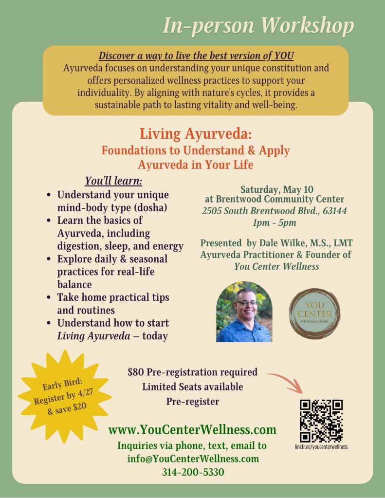 • Living Ayurveda Workshop – Learn how to align with your unique mind-body type and nature’s rhythms in this 4-hour workshop. You’ll discover the basics of Ayurveda, explore simple daily practices, and take home tools to support real-life balance and vitality. reserve your spot online now